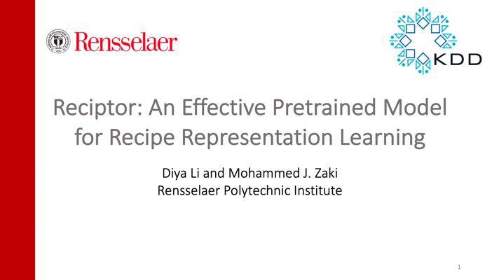 Recipe representation plays an important role in food computing for perception, recognition, recommendation and other applications. Learning pretrained recipe embeddings is a challenging task, as there is a lack of high quality annotated food datasets. In this paper, we provide a joint approach for learning effective pretrained recipe embeddings using both the ingredients and cooking instructions. We present RECIPTOR, a novel set transformer-based joint model to learn recipe representations, that preserves permutation-invariance for the ingredient set and uses a novel knowledge graph (KG) derived triplet sampling approach to optimize the learned embeddings so that related recipes are closer in the latent semantic space. The embeddings are further jointly optimized by combining similarity among cooking instructions with a KG based triplet loss. We experimentally show that RECIPTOR’s recipe embeddings outperform state-of-the-art baselines on two newly designed downstream classification tasks by a wide margin.