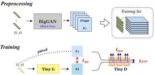 Generative Adversarial Networks (GANs) have become a powerful approach for generative image modeling. However, GANs are notorious for their training instability, especially on large-scale, complex datasets. While the recent work of BigGAN has significantly improved the quality of image generation on ImageNet, it requires a huge model, making it hard to deploy on resource-constrained devices. To reduce the model size, we propose a black-box knowledge distillation framework for compressing GANs, which highlights a stable and efficient training process. Given BigGAN as the teacher network, we manage to train a much smaller student network to mimic its functionality, achieving competitive performance on Inception and FID scores with the generator having 16 times fewer parameters.