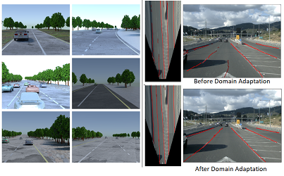 Accurate lane detection, a crucial enabler for autonomous driving, currently relies on obtaining a large and diverse labeled training dataset. In this work, we explore learning from abundant, randomly generated synthetic data, together with unlabeled or partially labeled target domain data, instead. Randomly generated synthetic data has the advantage of controlled variability in the lane geometry and lighting, but it is limited in terms of photo-realism. This poses the challenge of adapting models learned on the unrealistic synthetic domain to real images. To this end we develop a novel autoencoder-based approach that uses synthetic labels unaligned with particular images for adapting to target domain data. In addition, we explore existing domain adaptation approaches, such as image translation and self-supervision, and adjust them to the lane detection task. We test all approaches in the unsupervised domain adaptation setting in which no target domain labels are available and in the semi-supervised setting in which a small portion of the target images are labeled. In extensive experiments using three different datasets, we demonstrate the possibility to save costly target domain labeling efforts. For example, using our proposed autoencoder approach on the llamas and tuSimple lane datasets, we can almost recover the fully supervised accuracy with only 10% of the labeled data. In addition, our autoencoder approach outperforms all other methods in the semi-supervised domain adaptation scenario.