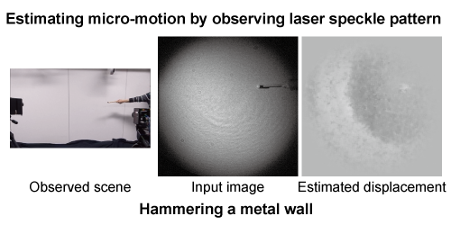 This paper proposes a method of estimating micro-motion of an object at eachpixel that is too small to detect under a common setup of camera andillumination. The method introduces an active-lighting approach to make themotion visually detectable. The approach is based on speckle pattern, which isproduced by the mutual interference of laser light on object's surface andcontinuously changes its appearance according to the out-of-plane motion of thesurface. In addition, speckle pattern becomes uncorrelated with large motion. Tocompensate such micro- and large motion, the method estimates the motionparameters up to scale at each pixel by nonlinear embedding of the specklepattern into low-dimensional space. The out-of-plane motion is calculated bymaking the motion parameters spatially consistent across the image. In theexperiments, the proposed method is compared with other measuring devices toprove the effectiveness of the method.
