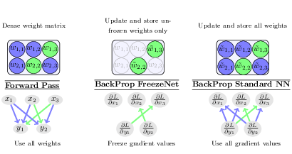 Pruning generates sparse networks by setting parameters tozero. In this work we improve one-shot pruning methods, applied beforetraining, without adding any additional storage costs while preservingthe sparse gradient computations. The main difference to pruning is thatwe do not sparsify the network’s weights but learn just a few key parame-ters and keep the other ones fixed at their random initialized value. Thismechanism is called freezing the parameters. Those frozen weights canbe stored efficiently with a single 32bit random seed number. The pa-rameters to be frozen are determined one-shot by a single for- and back-ward pass applied before training starts. We call the introduced methodFreezeNet. In our experiments we show that FreezeNets achieve good re-sults, especially for extreme freezing rates. Freezing weights preserves thegradient flow throughout the network and consequently, FreezeNets trainbetter and have an increased capacity compared to their pruned counter-parts. On the classification tasks MNIST and CIFAR-10/100 we outper-form SNIP, in this setting the best reported one-shot pruning method,applied before training. On MNIST, FreezeNet achieves 99.2% perfor-mance of the baseline LeNet-5-Caffe architecture, while compressing thenumber of trained and stored parameters by a factor of �_57.
