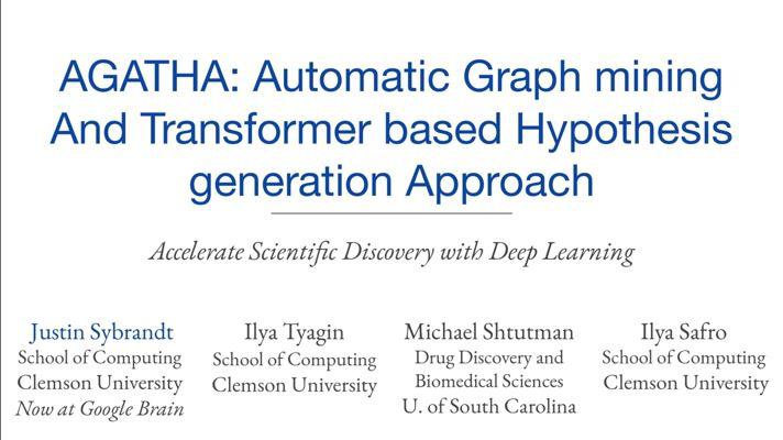 Medical research is risky and expensive. Drug discovery requires researchers to efficiently winnow thousands of potential targets to a small candidate set. However, scientists spend significant time and money long before seeing the intermediate results that ultimately determine this smaller set. Hypothesis generation systems address this challenge by mining the wealth of publicly available scientific information to predict plausible research directions. We present AGATHA, a deep-learning hypothesis generation system that learns a data-driven ranking criteria to recommend new biomedical connections. We massively validate our system with a temporal holdout wherein we predict connections first introduced after 2015 using data published beforehand. We additionally explore biomedical sub-domains, and demonstrate AGATHA’s predictive capacity across the twenty most popular relationship types. Furthermore, we perform an ablation study to examine the aspects of our semantic network that most contribute to recommendation quality. Overall, AGATHA achieves best-in-class recommendation quality when compared to other hypothesis generation systems built to predict across all available biomedical literature. Reproducibility: All code, experimental data, and pre-trained models are available online: sybrandt.com/2020/agatha.