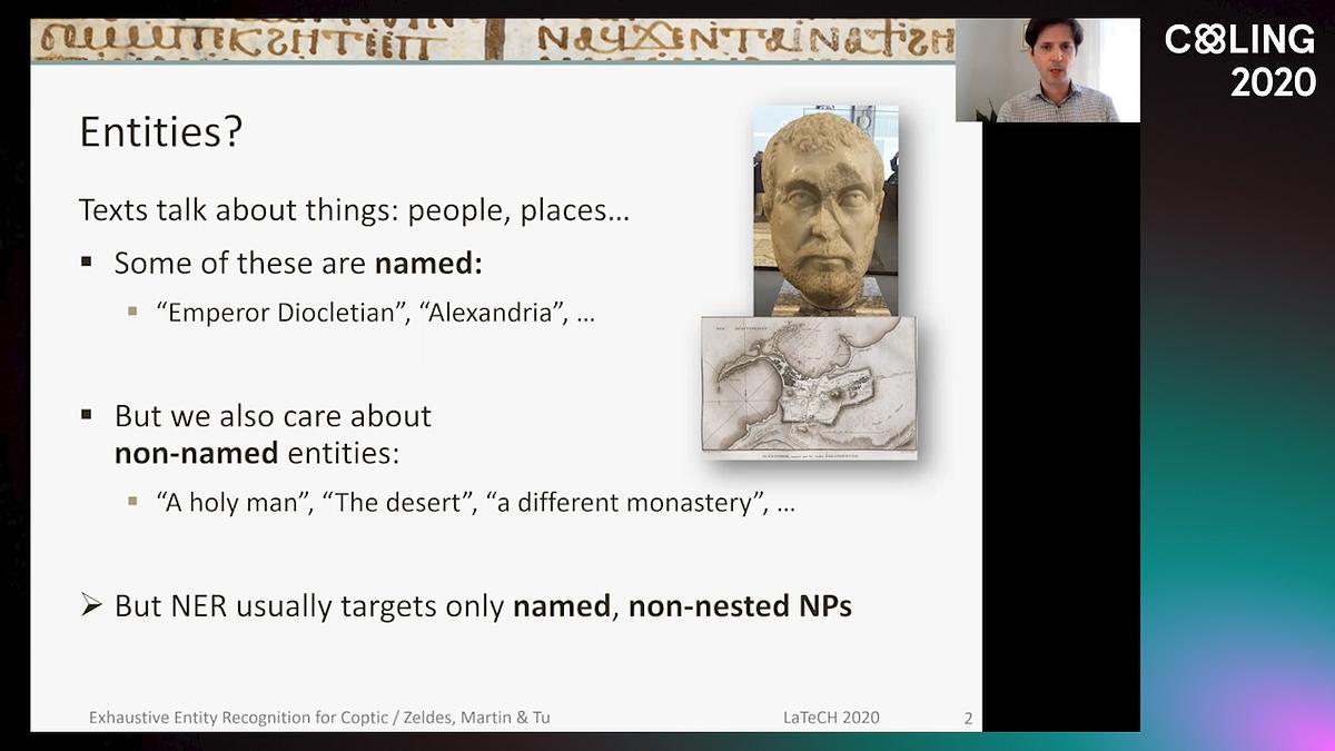 Entity recognition provides semantic access to ancient materials in the Digital Humanities: it exposes people and places of interest in texts that cannot be read exhaustively, facilitates linking resources and can provide a window into text contents, even for texts with no translations. In this paper we present entity recognition for Coptic, the language of Hellenistic era Egypt. We evaluate NLP approaches to the task and lay out difficulties in applying them to a low-resource, morphologically complex language. We present solutions for named and non-named nested entity recognition and semi-automatic entity linking to Wikipedia, relying on robust dependency parsing, feature-based CRF models, and hand-crafted knowledge base resources, enabling high accuracy NER with orders of magnitude less data than those used for high resource languages. The results suggest avenues for research on other languages in similar settings.