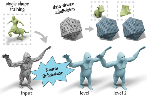 This paper introduces Neural Subdivision, a novel framework for data-driven coarse-to-fine geometry modeling. During inference, our method takes a coarse triangle mesh as input and recursively subdivides it to a finer geometry by applying the fixed topological updates of Loop Subdivision, but predicting vertex positions using a neural network conditioned on the local geometry of a patch. This approach enables us to learn complex non-linear subdivision schemes, beyond simple linear averaging used in classical techniques. One of our key contributions is a novel self-supervised training setup that only requires a set of high-resolution meshes for learning network weights. For any training shape, we stochastically generate diverse low-resolution discretizations of coarse counterparts, while maintaining a bijective mapping that prescribes the exact target position of every new vertex during the subdivision process. This leads to a very efficient and accurate loss function for conditional mesh generation, and enables us to train a method that generalizes across discretizations and favors preserving the manifold structure of the output. During training we optimize for the same set of network weights across all local mesh patches, thus providing an architecture that is not constrained to a specific input mesh, fixed genus, or category. Our network encodes patch geometry in a local frame in a rotation- and translation-invariant manner. Jointly, these design choices enable our method to generalize well, and we demonstrate that even when trained on a single high-resolution mesh our method generates reasonable subdivisions for novel shapes.