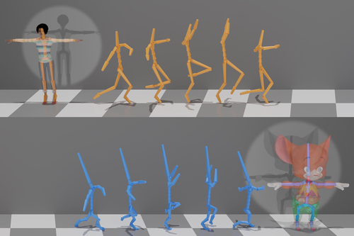We introduce a novel deep learning framework for data-driven motion retargeting between skeletons, which may have different structure, yet corresponding to homeomorphic graphs. Importantly, our approach learns how to retarget without requiring any explicit pairing between the motions in the training set.We leverage the fact that different homeomorphic skeletons may be reduced to a common primal skeleton by a sequence of edge merging operations, which we refer to as skeletal pooling. Thus, our main technical contribution is the introduction of novel differentiable convolution, pooling, and unpooling operators. These operators are skeleton-aware, meaning that they explicitly account for the skeleton’s hierarchical structure and joint adjacency, and together they serve to transform the original motion into a collection of deep temporal features associated with the joints of the primal skeleton. In other words, our operators form the building blocks of a new deep motion processing framework that embeds the motion into a common latent space, shared by a collection of homeomorphic skeletons. Thus, retargeting can be achieved simply by encoding to, and decoding from this latent space.Our experiments show the effectiveness of our framework for motion retargeting, as well as motion processing in general, compared to existing approaches. Our approach is also quantitatively evaluated on a synthetic dataset that contains pairs of motions applied to different skeletons. To the best of our knowledge, our method is the first to perform retargeting between skeletons with differently sampled kinematic chains, without any paired examples.