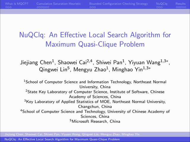 The maximum quasi-clique problem (MQCP) is an important extension of maximum clique problem with wide applications. Recent heuristic MQCP algorithms can hardly solve large and hard graphs effectively. This paper develops an efficient local search algorithm named NuQClq for the MQCP, which has two main ideas. First, we propose a novel vertex selection strategy, which utilizes cumulative saturation information to be a selection criterion when the candidate vertices have equal values on the primary scoring function. Second, a variant of configuration checking named BoundedCC is designed by setting an upper bound for the threshold of forbidding strength. When the threshold value of vertex exceeds the upper bound, we reset its threshold value to increase the diversity of search process. Experiments on a broad range of classic benchmarks and sparse instances show that NuQClq significantly outperforms the state-of-the-art MQCP algorithms for most instances.