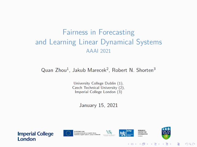 In machine learning, training data often capture the behaviour of multiple subgroups of some underlying human population. When the amounts of training data for the subgroups are not controlled carefully, under-representation bias arises. We introduce two natural notions of subgroup fairness and instantaneous fairness to address such under-representation bias in time-series forecasting problems. In particular, we consider the subgroup-fair and instant-fair learning of a linear dynamical system (LDS) from multiple trajectories of varying lengths and the associated forecasting problems. We provide globally convergent methods for the learning problems using hierarchies of convexifications of non-commutative polynomial optimisation problems. Our empirical results on a biased data set motivated by insurance applications and the well-known COMPAS data set demonstrate both the beneficial impact of fairness considerations on statistical performance and the encouraging effects of exploiting sparsity on run time.