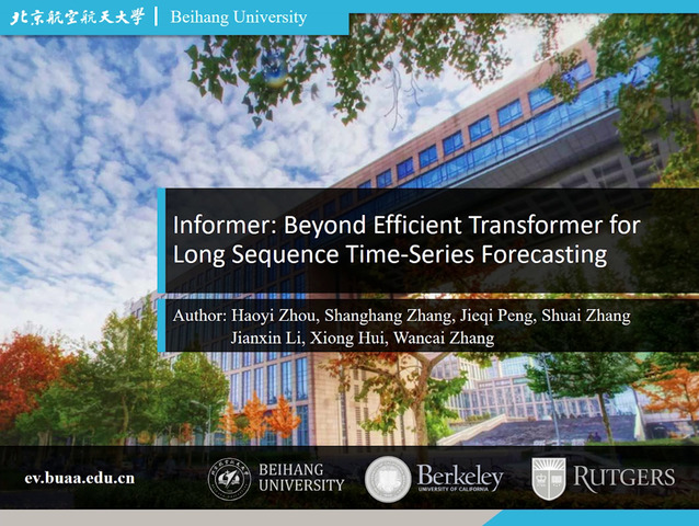 Many real-world applications require the prediction of long sequence time-series, such as electricity consumption planning. Long sequence time-series forecasting (LSTF) demands a high prediction capacity of the model, which is the ability to capture precise long-range dependency coupling between output and input efficiently. Recent studies have shown the potential of Transformer to increase the prediction capacity. However, there are several severe issues with Transformer that prevent it from being directly applicable to LSTF, including quadratic time complexity, high memory usage, and inherent limitation of the encoder-decoder architecture. To address these issues, we design an efficient transformer-based model for LSTF, named Informer, with three distinctive characteristics: (i) a ProbSparse self-attention mechanism, which achieves O(L log L) in time complexity and memory usage, and has comparable performance on sequences' dependency alignment. (ii) the self-attention distilling highlights dominating attention by halving cascading layer input, and efficiently handles extreme long input sequences. (iii) the generative style decoder, while conceptually simple, predicts the long time-series sequences at one forward operation rather than a step-by-step way, which drastically improves the inference speed of long-sequence predictions. Extensive experiments on four large-scale datasets demonstrate that Informer significantly outperforms existing methods and provides a new solution to the LSTF problem.
