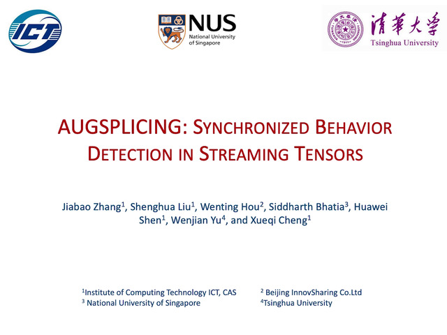 How can we track synchronized behavior in a stream of time-stamped tuples, such as mobile devices installing and uninstalling applications in the lockstep, to boost their ranks in the app store? We model such tuples as entries in a streaming tensor, which augments attribute sizes in its modes over time. Synchronized behavior tends to form dense blocks (i.e.~subtensors) in such a tensor, signaling anomalous behavior, or interesting communities. However, existing dense block detection methods are either based on a static tensor, or lack an efficient algorithm in a streaming setting. Therefore, we propose a fast streaming algorithm, AUGSPLICING, which can detect the top dense blocks by incrementally splicing the previous detection with the incoming ones in new tuples, avoiding re-runs over all the history data at every tracking time step. AUGSPLICING is based on a splicing condition that guides the algorithm (Section 4). Compared to the state-of-the-art methods, our method is (1) effective to detect fraudulent behavior in installing data of real-world apps and find a synchronized group of students with interesting features in campus Wi-Fi data; (2) robust with splicing theory for dense block detection; (3) streaming and faster than the existing streaming algorithm, with closely comparable accuracy.