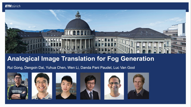 Image-to-image translation is to map images from a given style to another given style. While exceptionally successful, current methods assume the availability of training images in both source and target domains, which does not always hold in practice. Inspired by humans' reasoning capability of analogy, we propose analogical image translation (AIT) that exploit the concept of gist, for the first time. Given images of two styles in the source domain: A and A', along with images B of the first style in the target domain, learn a model to translate B to B' in the target domain, such that A:A' :: B:B'. AIT is especially useful for translation scenarios in which training data of one style is hard to obtain but training data of the same two styles in another domain is available. For instance, in the case from normal conditions to extreme, rare conditions, obtaining real training images for the latter case is challenging. However, obtaining synthetic data for both cases is relatively easy. In this work, we aim at adding adverse weather effects, more specifically fog, to images taken in clear weather. To circumvent the challenge of collecting real foggy images, AIT learns the gist of translating synthetic clear-weather to foggy images, followed by adding fog effects onto real clear-weather images, without ever seeing any real foggy image. AIT achieves zero-shot image translation capability, whose effectiveness and benefit are demonstrated by the downstream task of semantic foggy scene understanding.