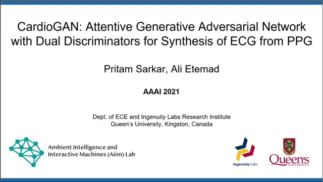 Electrocardiogram (ECG) is the electrical measurement of cardiac activity, whereas Photoplethysmogram (PPG) is the optical measurement of volumetric changes in blood circulation. While both signals are used for heart rate monitoring, from a medical perspective, ECG is more useful as it carries additional cardiac information. Despite many attempts toward incorporating ECG sensing in smartwatches or similar wearable devices for continuous and reliable cardiac monitoring, PPG sensors are the main feasible sensing solution available. In order to tackle this problem, we propose CardioGAN, an adversarial model which takes PPG as input and generates ECG as output. The proposed network utilizes an attention-based generator to learn local salient features, as well as dual discriminators to preserve the integrity of generated data in both time and frequency domains. Our experiments show that the ECG generated by CardioGAN provides more reliable heart rate measurements compared to the original input PPG, reducing the error from 9.74 beats per minute (measured from the PPG) to 2.89 (measured from the generated ECG).