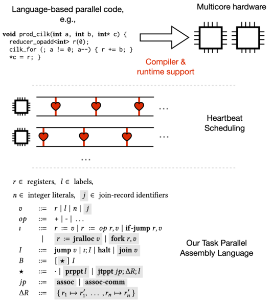 Achieving parallel performance and scalability involves making compromises between parallel and sequential computation. If not contained, the overheads of parallelism can easily outweigh its benefits, sometimes by orders of magnitude. Today, we expect programmers to implement this compromise by optimizing their code manually. This process is labor intensive, requires deep expertise, and reduces code quality. Recent work on heartbeat scheduling shows a promising approach that manifests the potentially vast amounts of available, latent parallelism, at a regular rate, based on even beats in time. The idea is to amortize the overheads of parallelism over the useful work performed between the beats. Heartbeat scheduling is promising in theory, but the reality is complicated: it has no known practical implementation. In this paper, we propose a practical approach to heartbeat scheduling that involves equipping the assembly language with a small set of primitives. These primitives leverage existing kernel and hardware support for interrupts to allow parallelism to remain latent, until a heartbeat, when it can be manifested with low cost. Our Task Parallel Assembly Language (TPAL) is a compact, RISC-like assembly language. We specify TPAL through an abstract machine and implement the abstract machine as compiler transformations for C/C++ code and a specialized run-time system. We present an evaluation on both the Linux and the Nautilus kernels, considering a range of heartbeat interrupt mechanisms. The evaluation shows that TPAL can dramatically reduce the overheads of parallelism without compromising scalability.